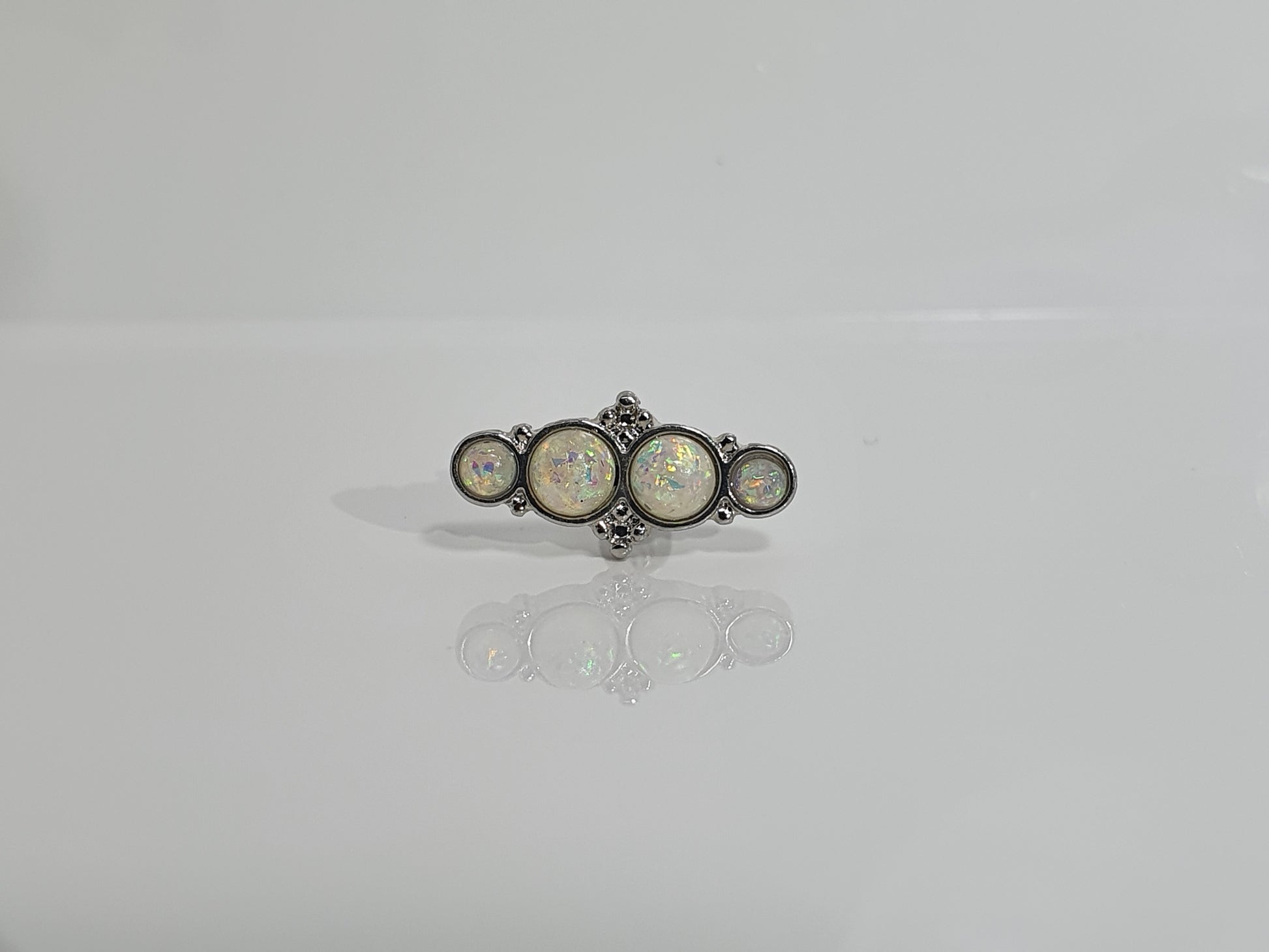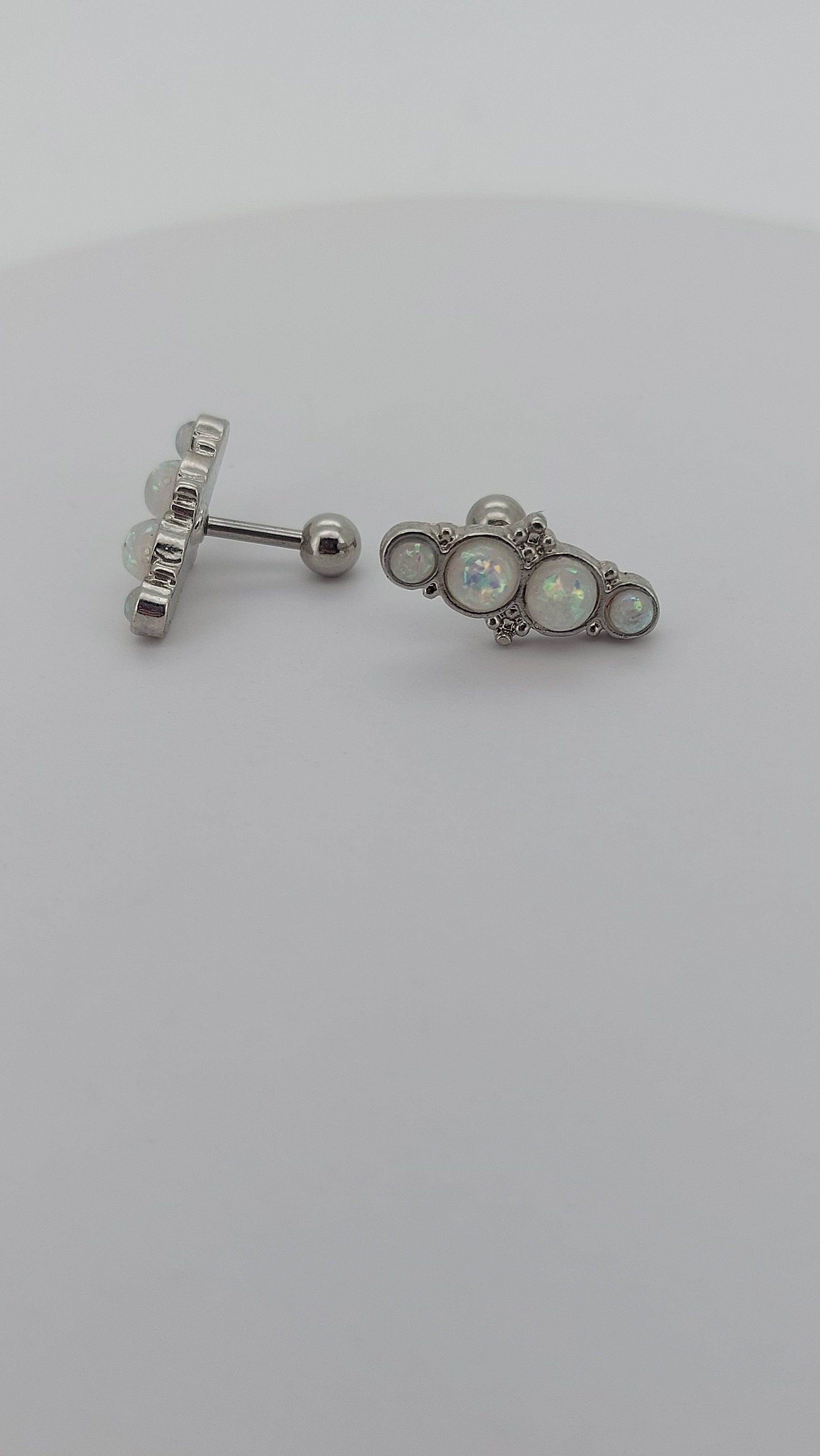 Enhance your look with our White Opal Helix Bar featuring 4 stunning opals and an elegant ball backing. Made with an externally threaded surgical steel bar, this pierce is perfect for helix, flat, and conch ear piercings, adding a touch of glamour and versatility to your style. Don't miss out on this must-have accessory!