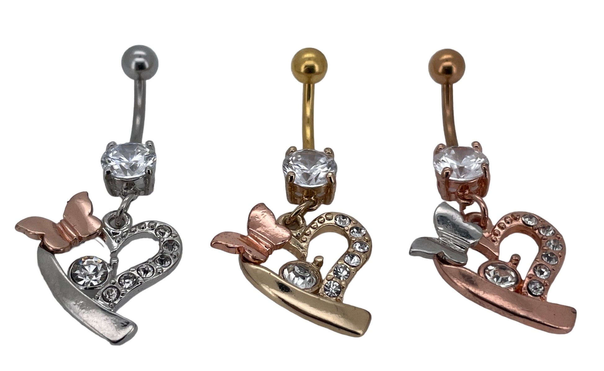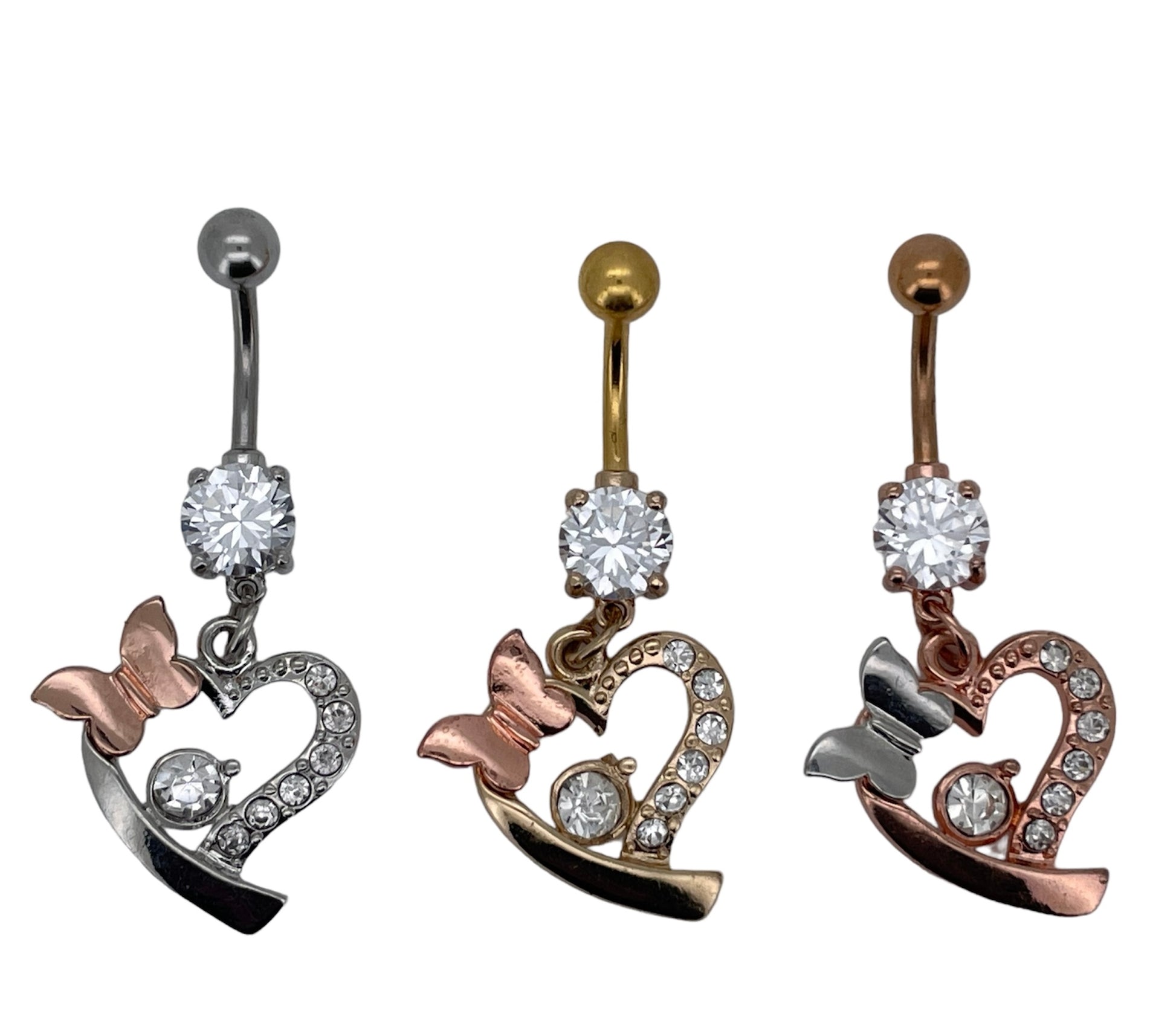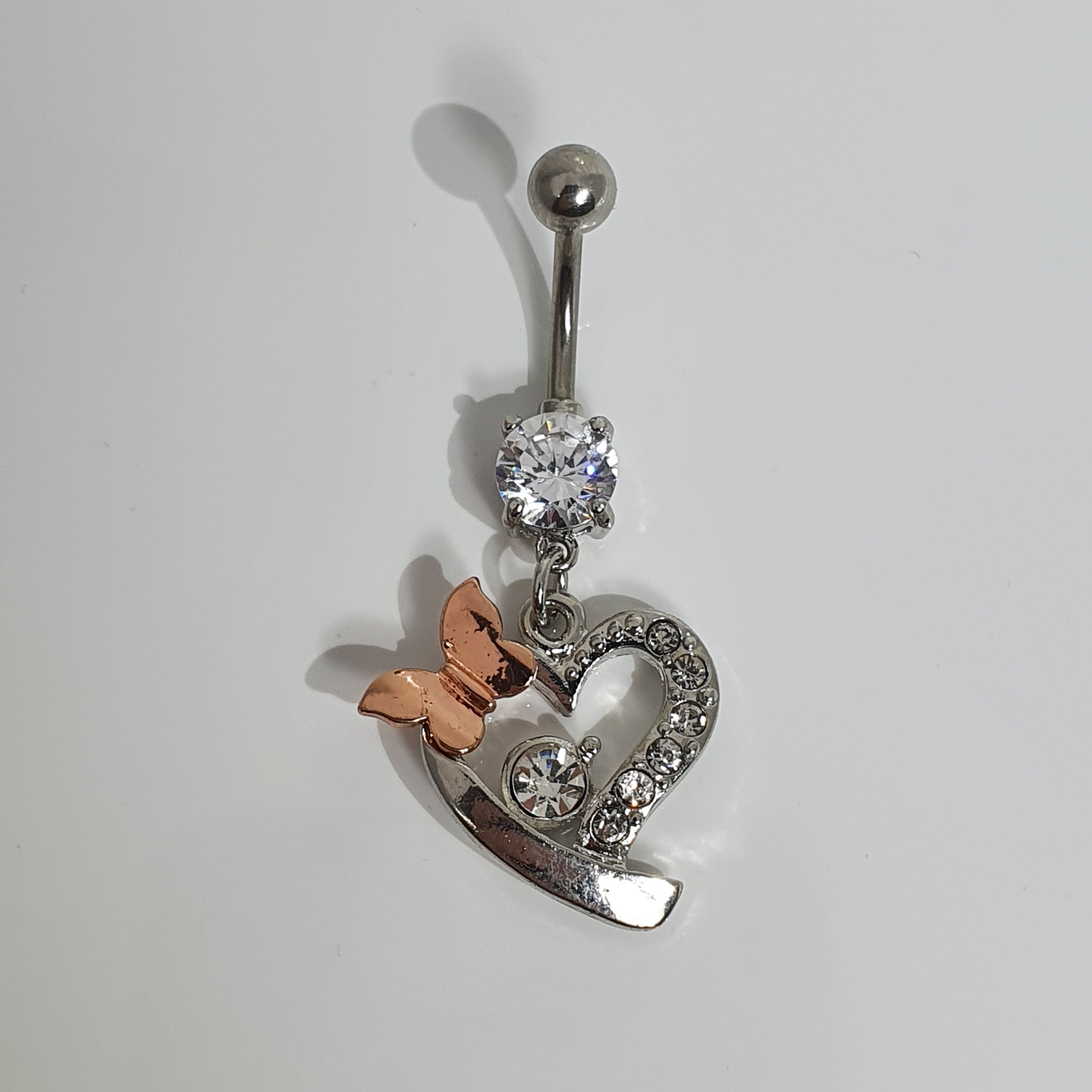 Beautiful crystal navel bar with jewelled heart charm and butterfly feature in contrasting colour. Available in 3 main colour options - Silver, Gold and Rose Gold. Size to fit a standard navel/belly piercing.