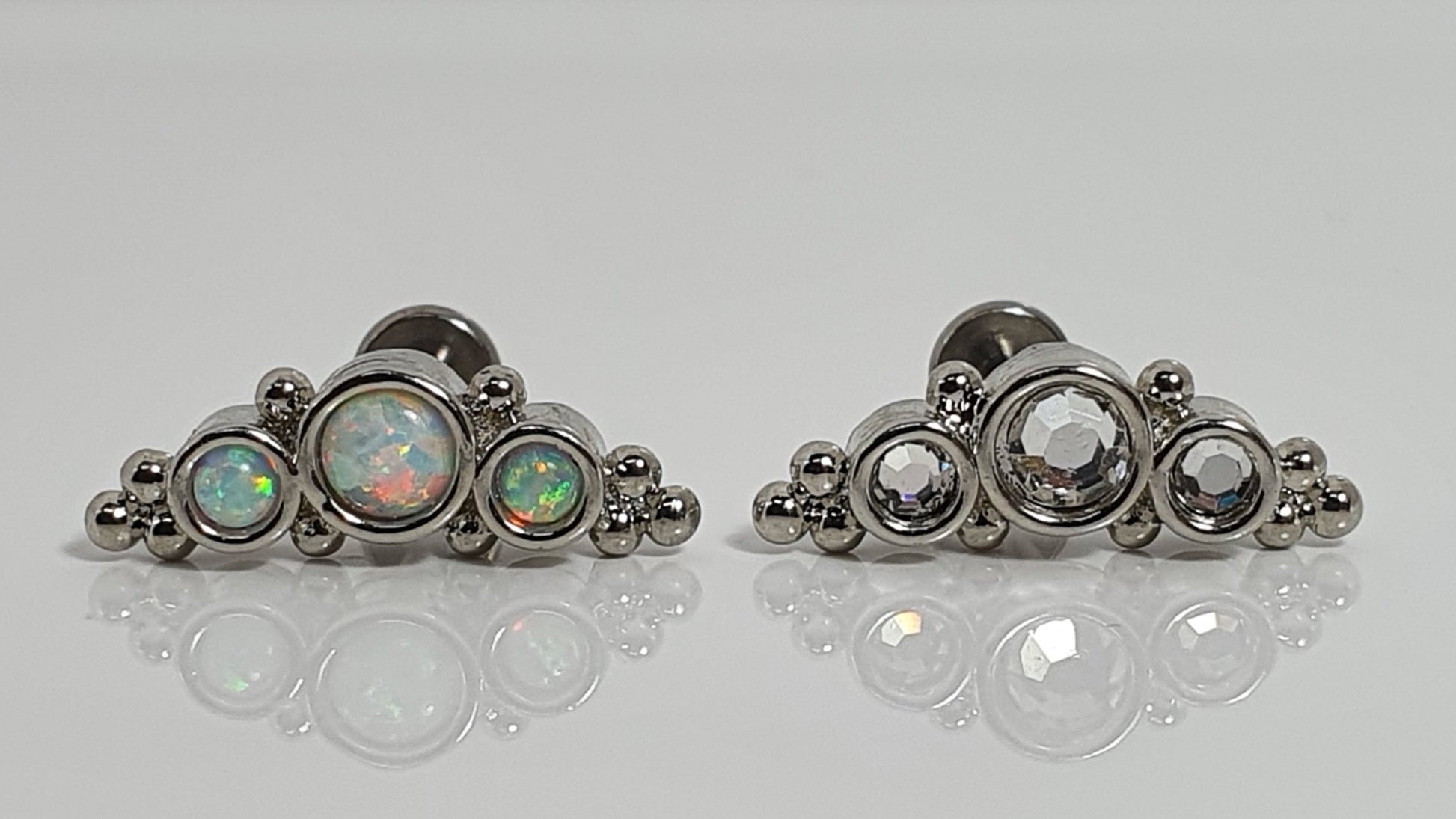 Crescent Gem Cluster - 3 gorgeous crystals in bezel set with additional silver decal. Available in 2 sizes. Internally threaded flat backs for added comfort. Ideal for helix, flat, conch, forward helix & tragus piercings.