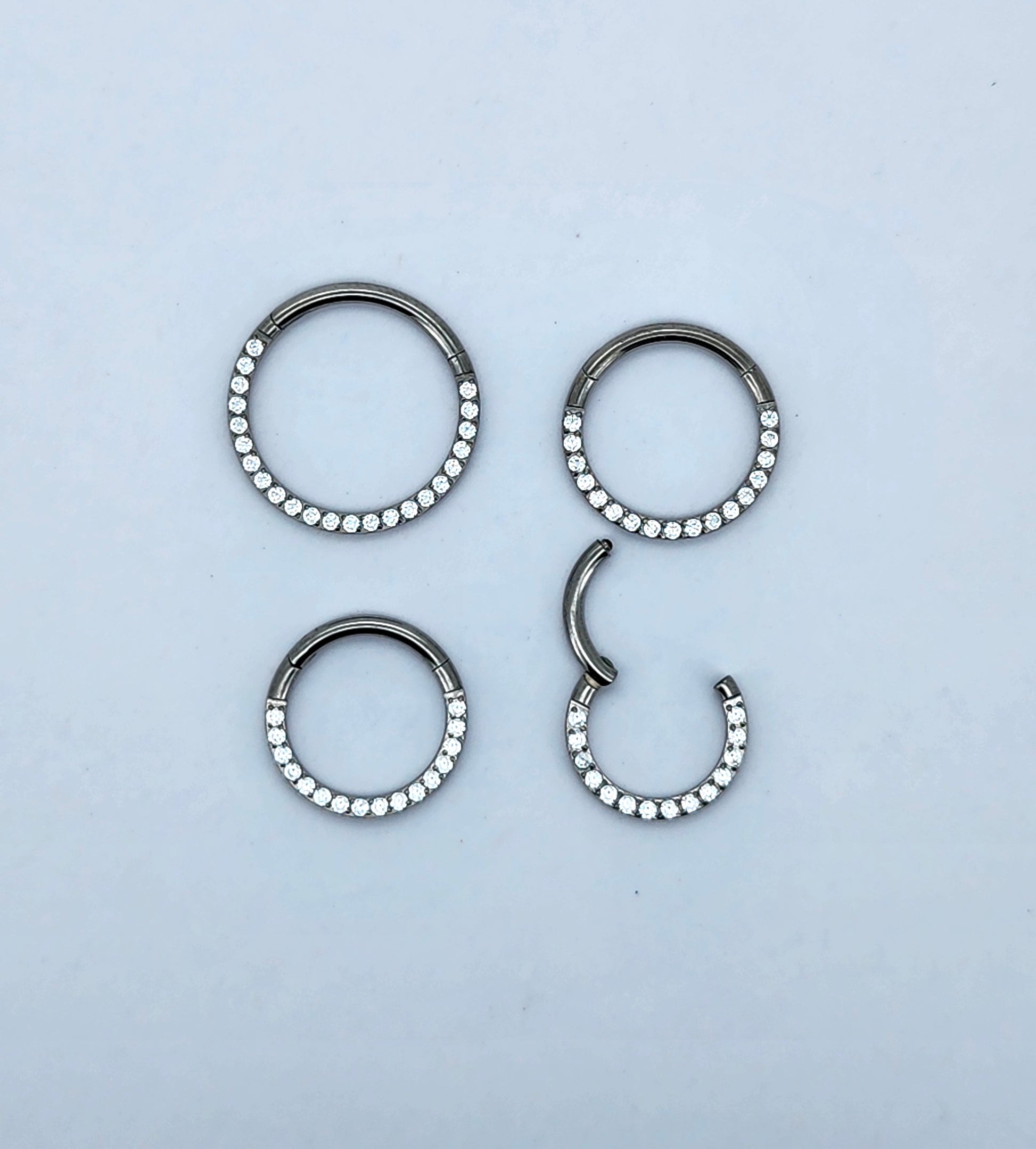 Titanium hinged ring with forward facing white crystals. Ideal for daith and septum piercings.