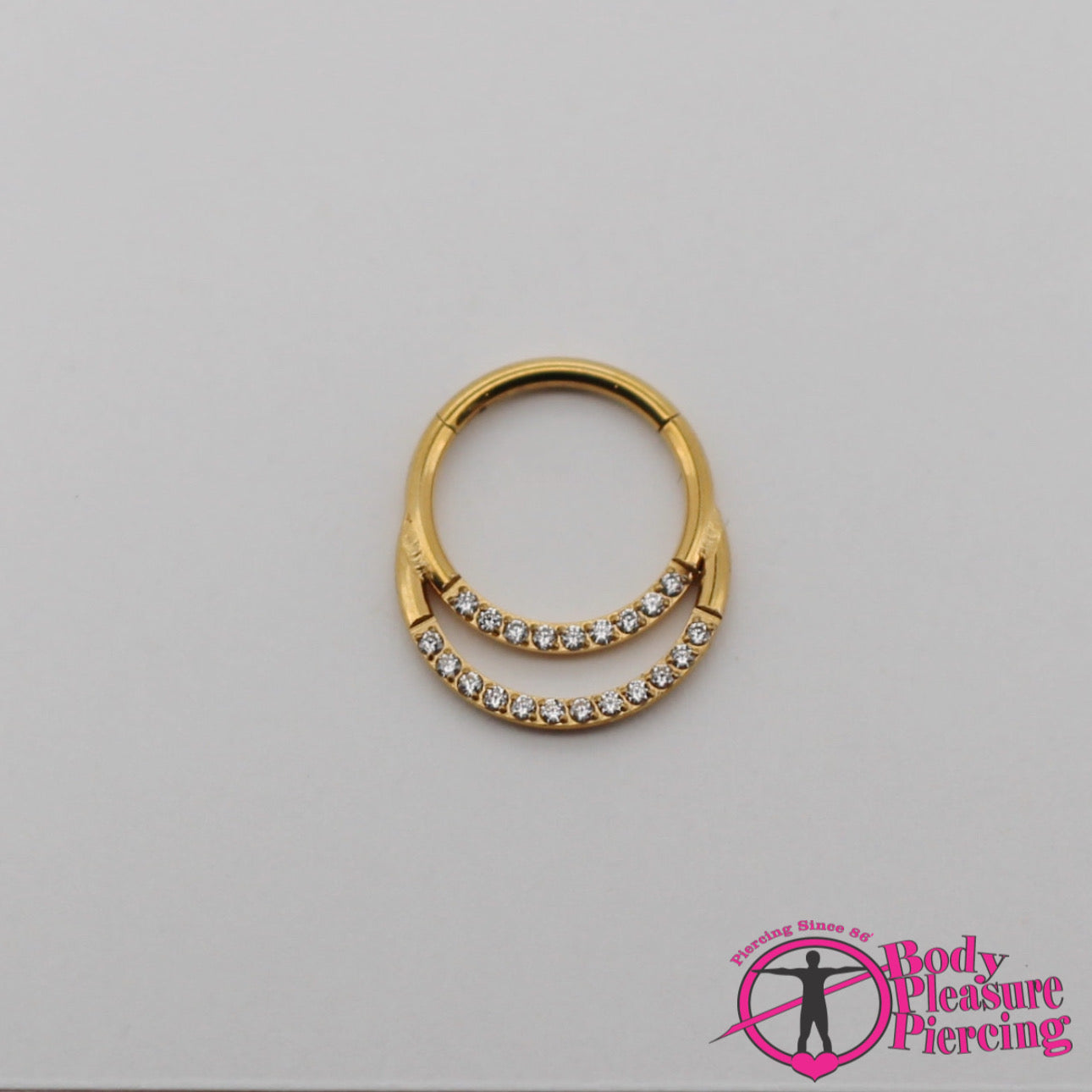 The Double Trouble Septum Ring features a double row of sparkling crystal jewels, adding a touch of glamour to any septum piercing. Available in both gold and silver finishes, this ring is a must-have statement piece for anyone looking to elevate their septum piercing game.