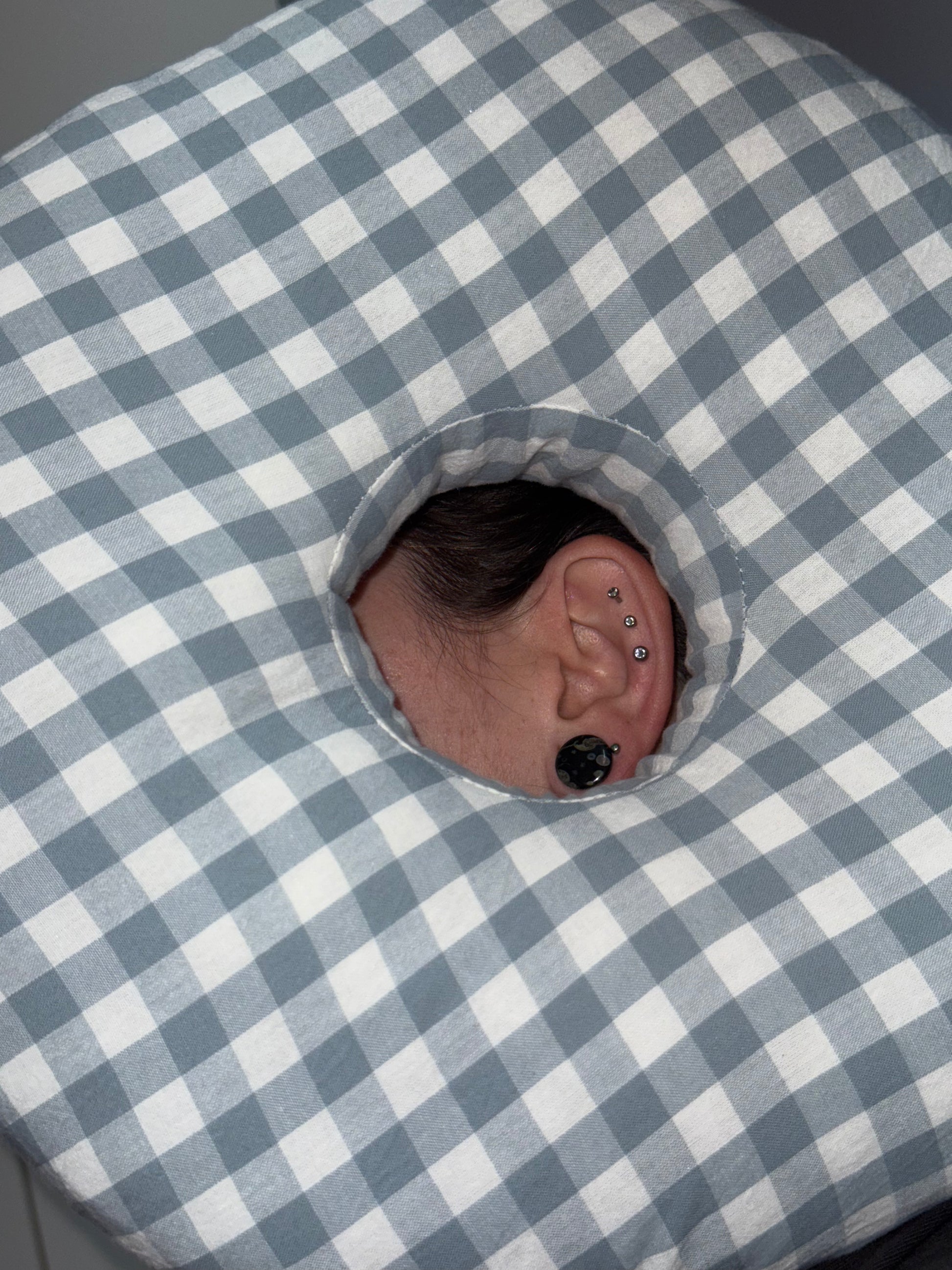The Ear Pillow is a must-have for anyone with healing cartilage piercings. It’s light blue and tartan design makes it attractive while it reduces pressure on the ear, promoting healing and comfort. Say goodbye to uncomfortable nights and hello to pain-free recovery with this innovative product.
