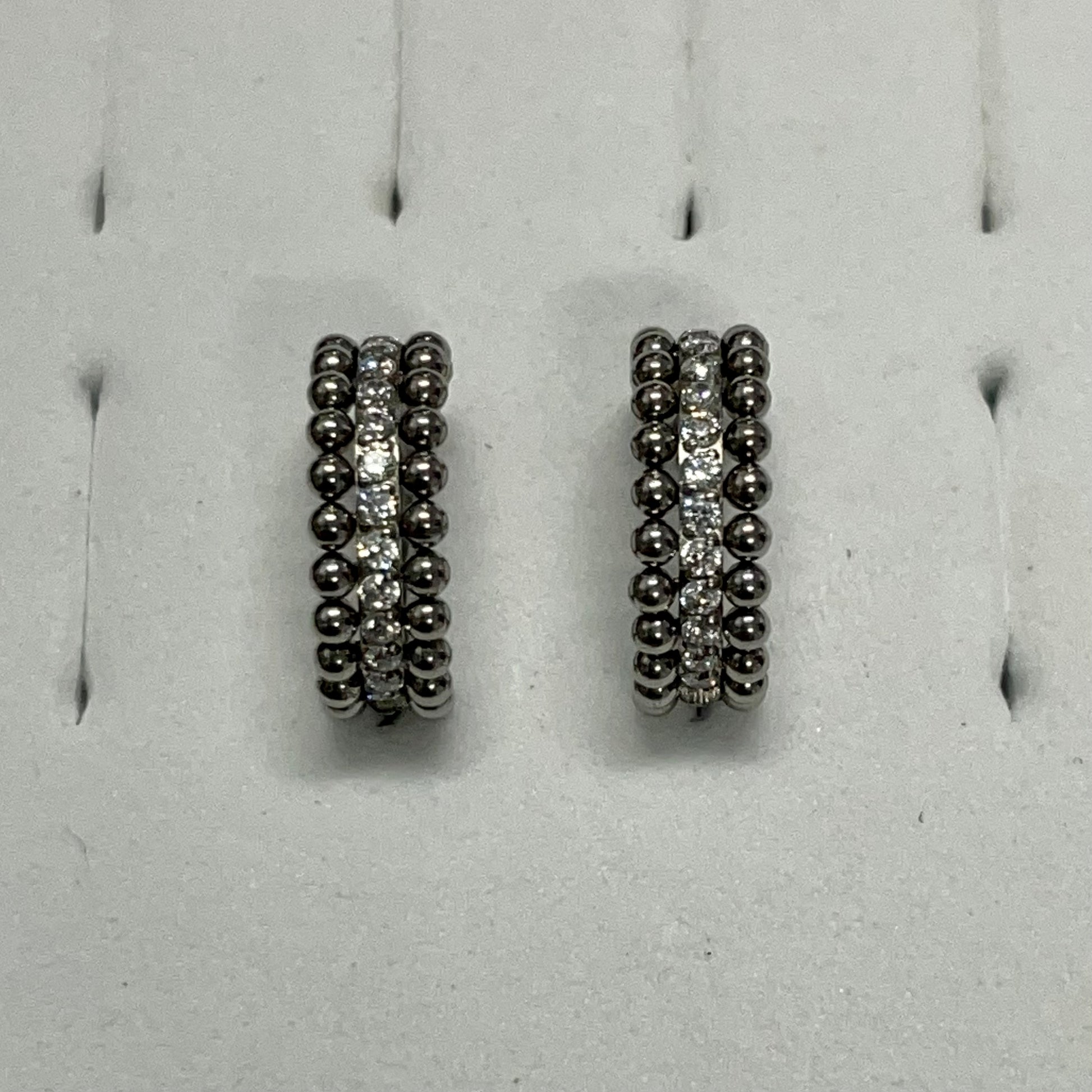 Garter style titanium hinged ring with an internal row of crystals surrounded by a row of studded silver on each side. Ideal for helix, forward helix, and tragus piercings. Also suitable for rook, eyebrow & anti-tragus piercings.