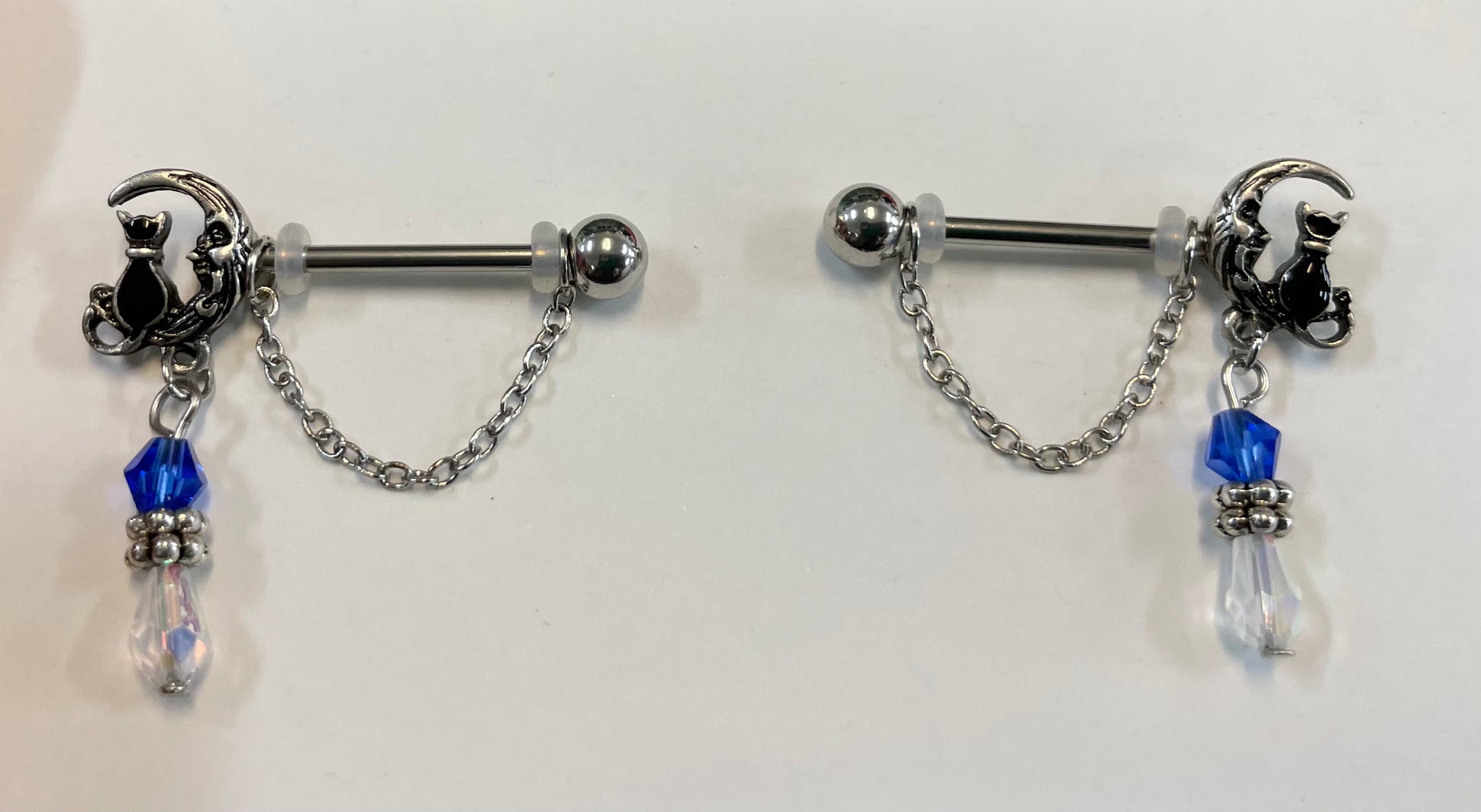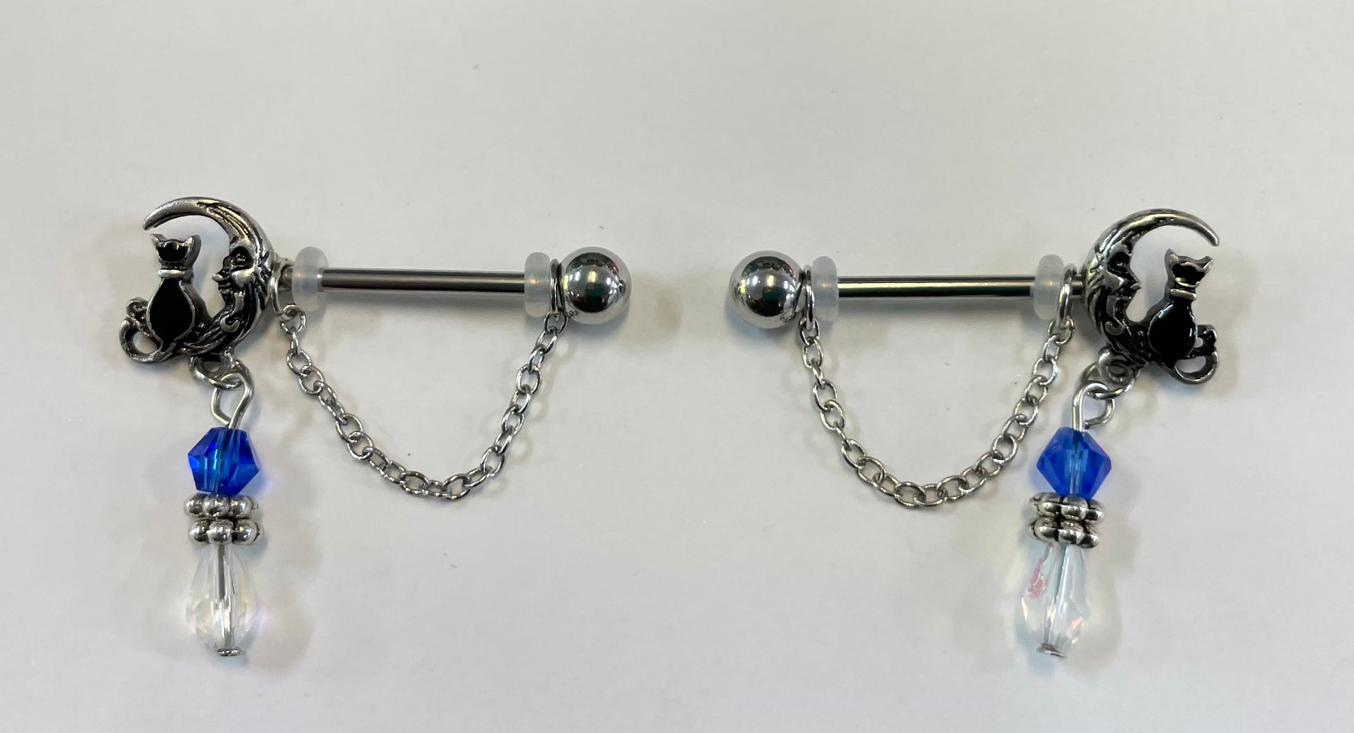 Surgical steel nipple bars with decorative hanging end featuring a fixed moon & cat. These also have a removable chain. Come as a pair - left & right.