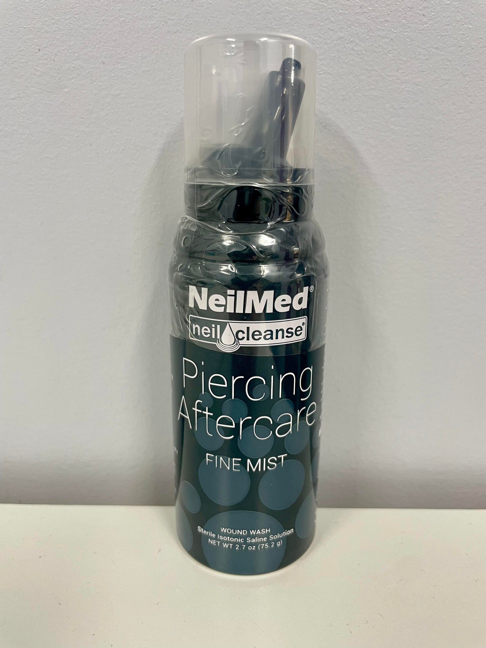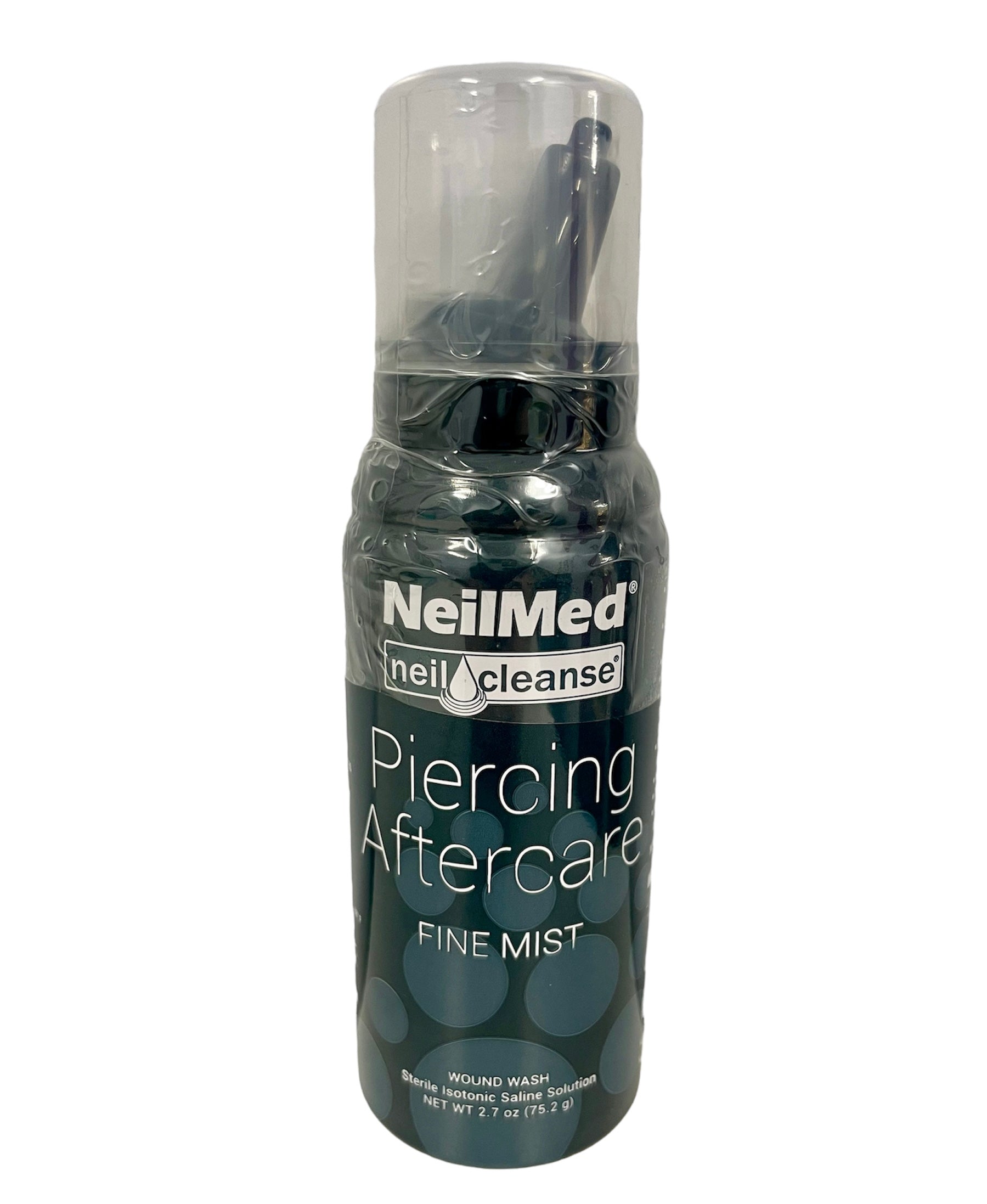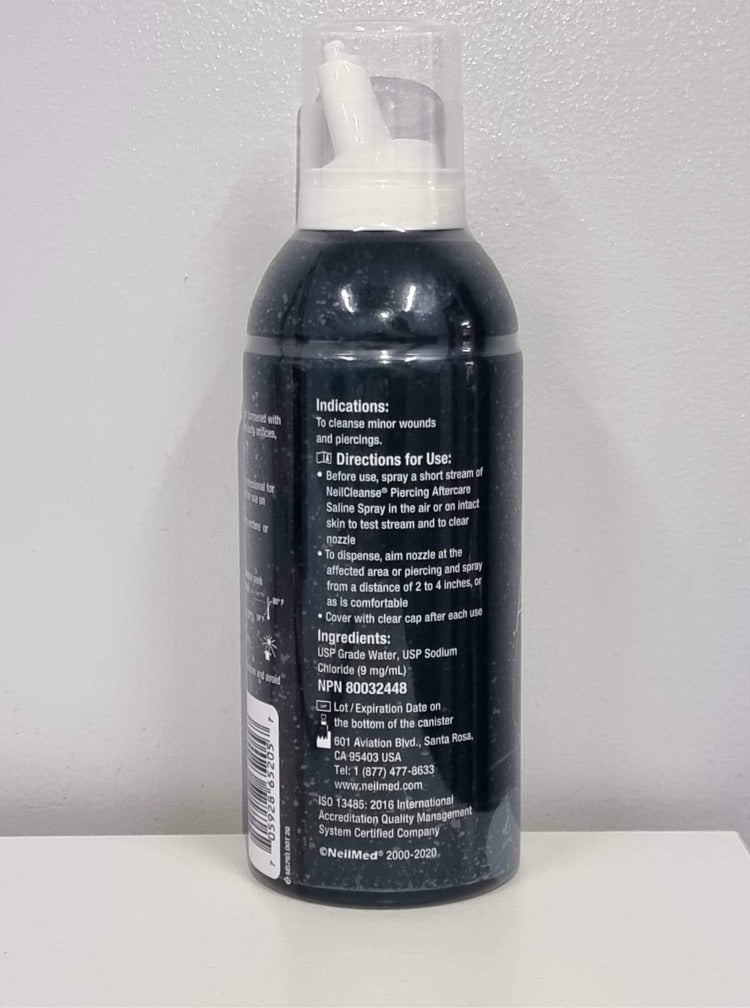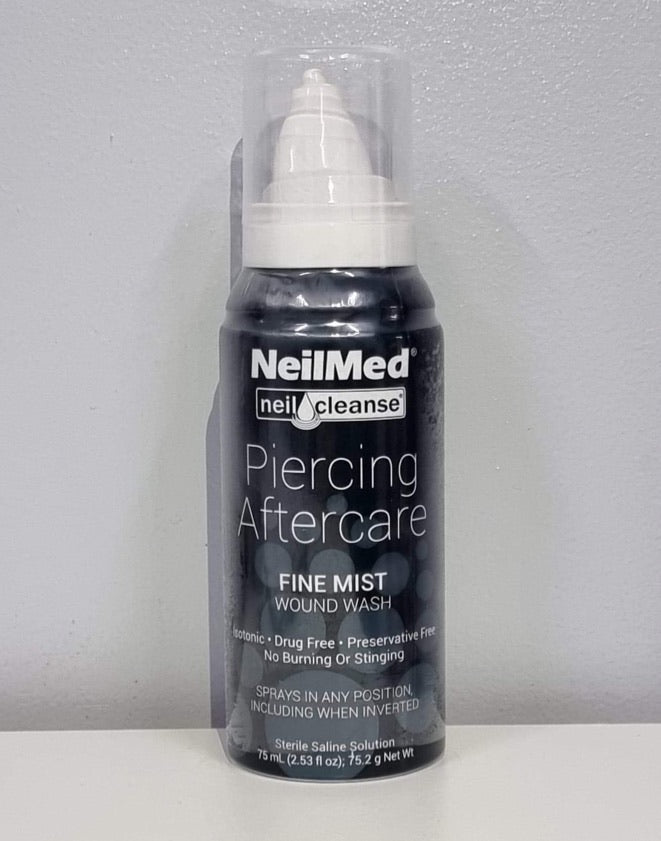 NeilMed Wound Wash Piercing Aftercare. Fine Mist wound wash. Isotonic. Drug Free. Preservative Free. No Stinging Or Burning. Sterile Saline Solution available in Large 177 mL (6 fl oz) & 75.2 mL (2.7 fl oz).