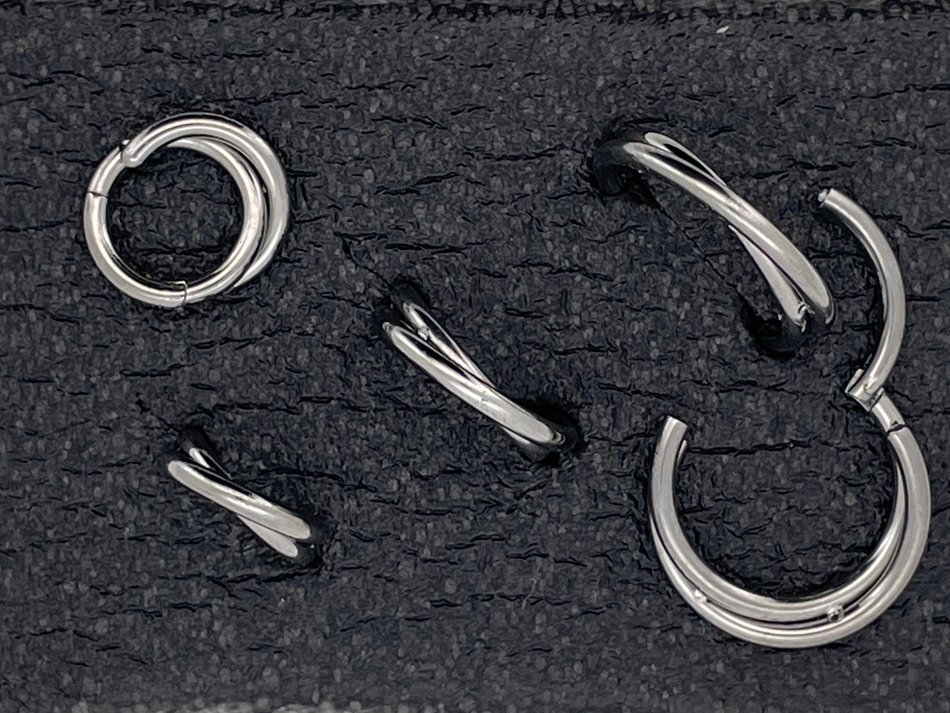Overlapping style hinged ring. Made to look like 2 rings overlapping while still fitting a standard piercing size. Ideal for any cartilage piercings.