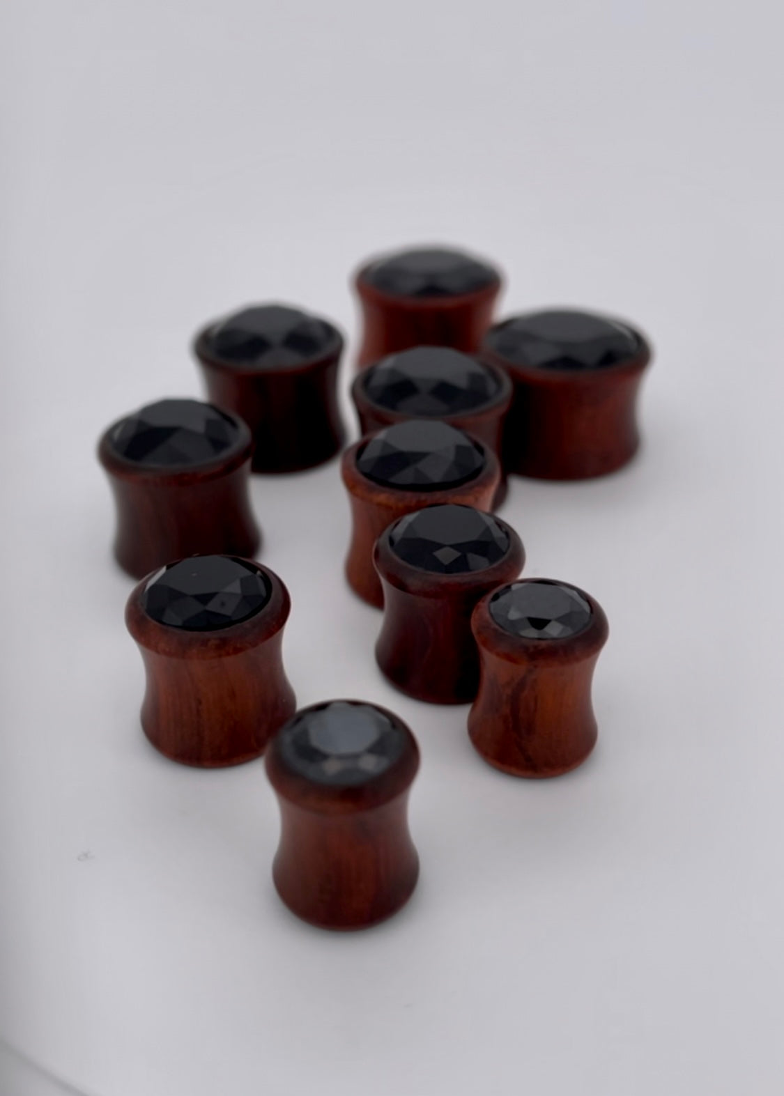 Sono wood plug with jet black crystal inlay. These plugs come in a variety of sizes. These plugs are crafted from high-quality sono wood and feature a stunning jet black crystal inlay. Available in multiple sizes, they offer a comfortable and stylish way to elevate your collection.