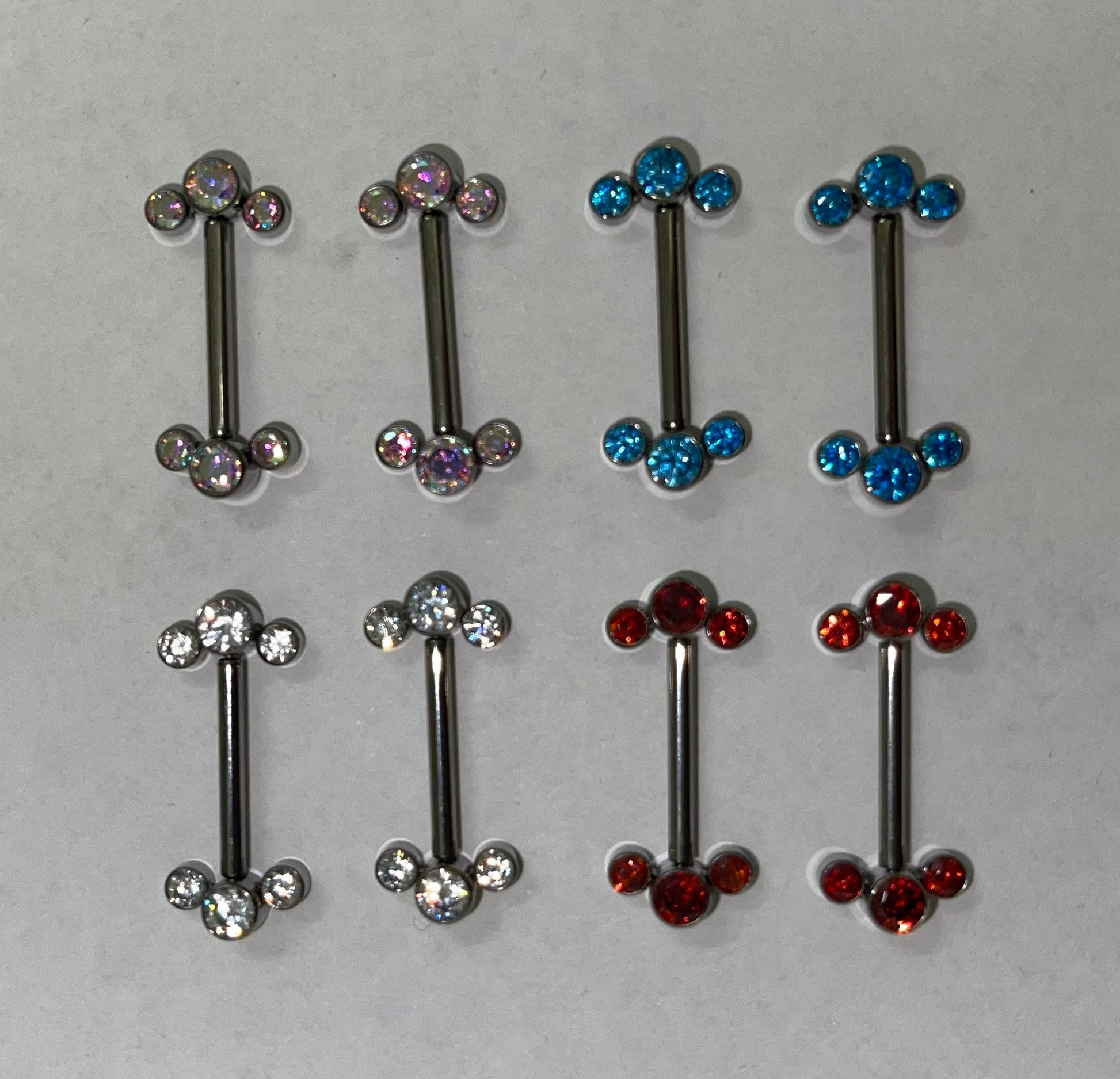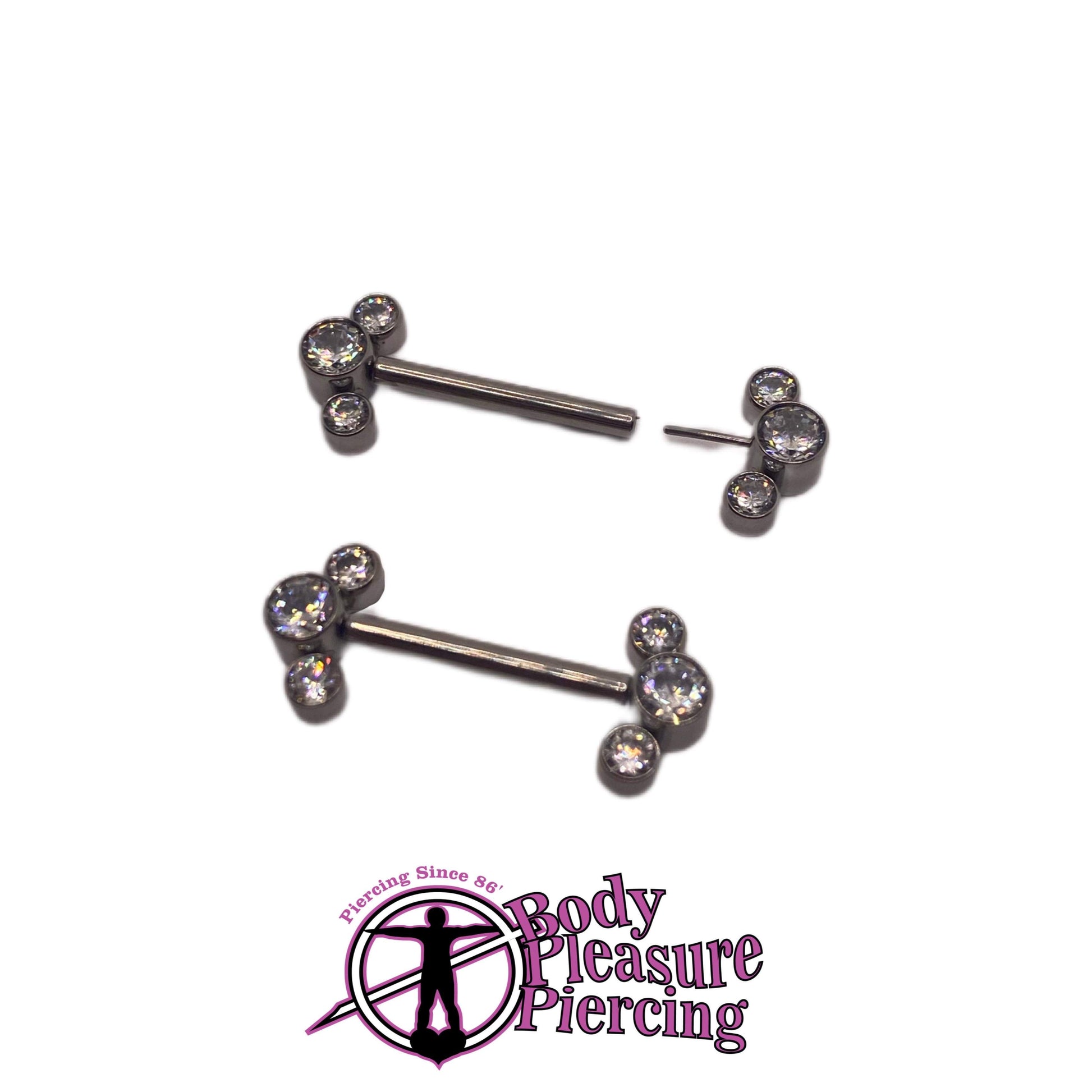 Gorgeous threadless nipple bar with tri-jewel ends in medical grade titanium.