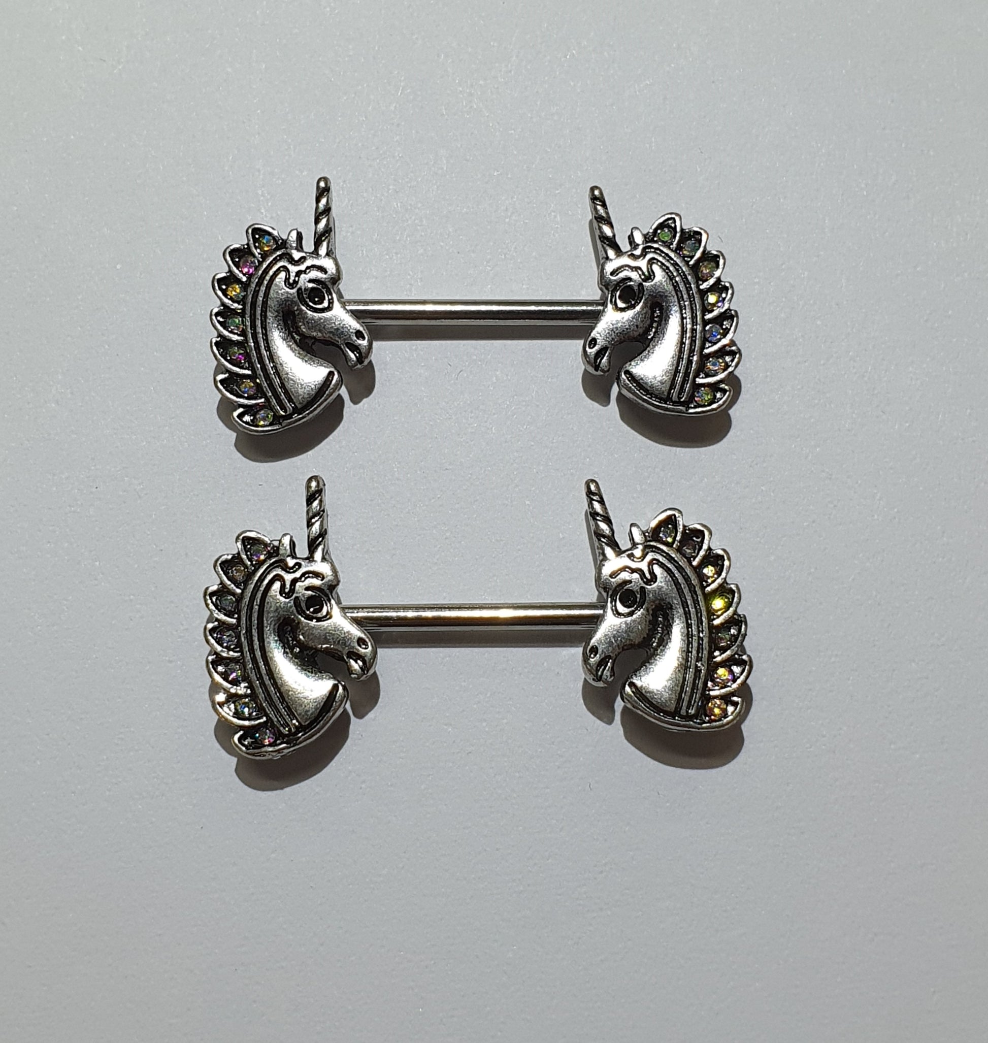 Unicorn Nipple Bar with Aurora Borealis Jewels. Surgical steel barbell with silver plated unicorn ends, one fixed and one threaded. Ideal for nipple piercings - consider the size of the nipple before purchasing, must be less than 12mm wide.