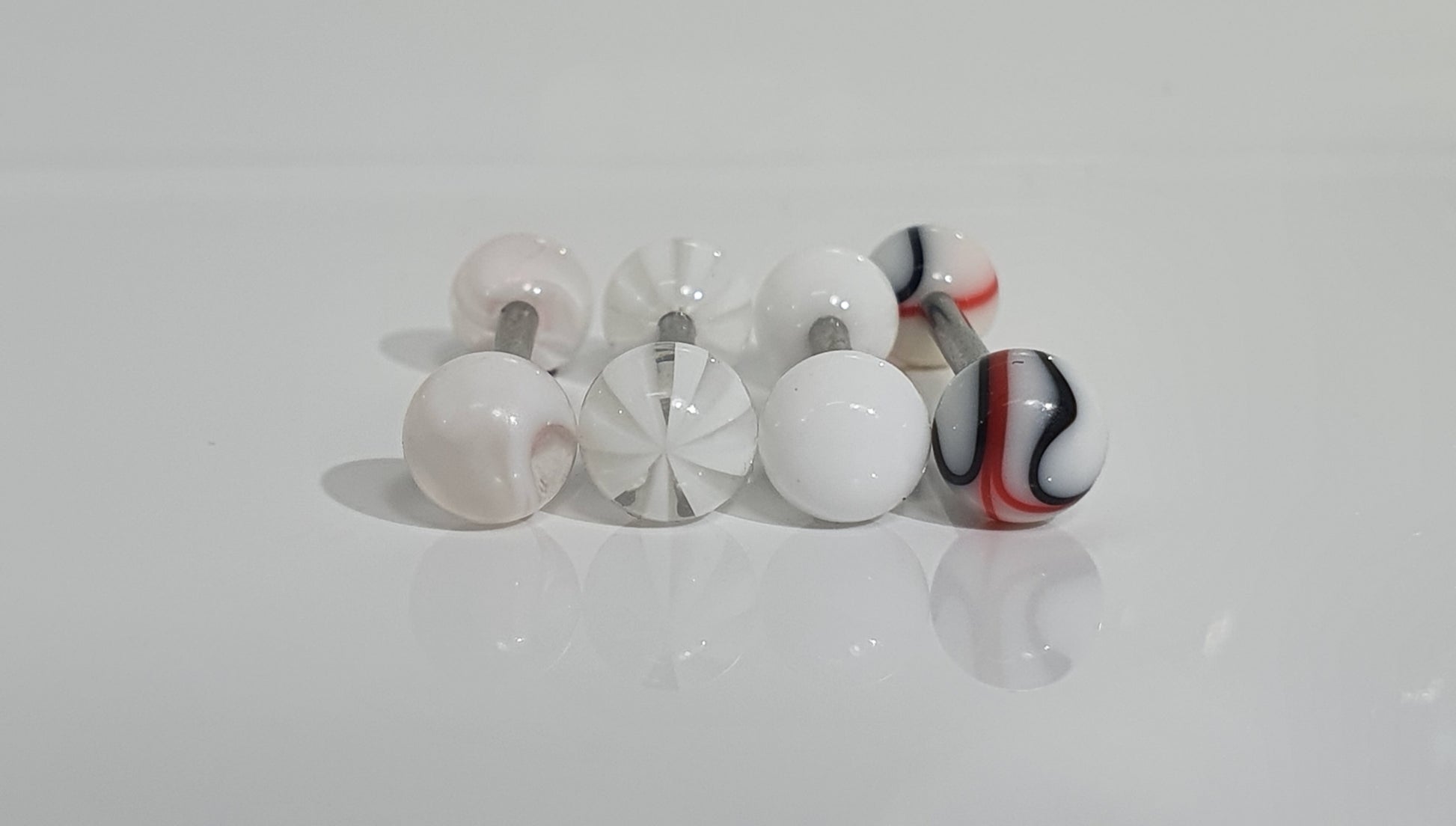 White Tongue Barbell. These bars are ideal for tongue piercings and can also be used in nipple piercings. External thread surgical steel bar with plastic balls. Various designs - one randomly selected from displayed options.
