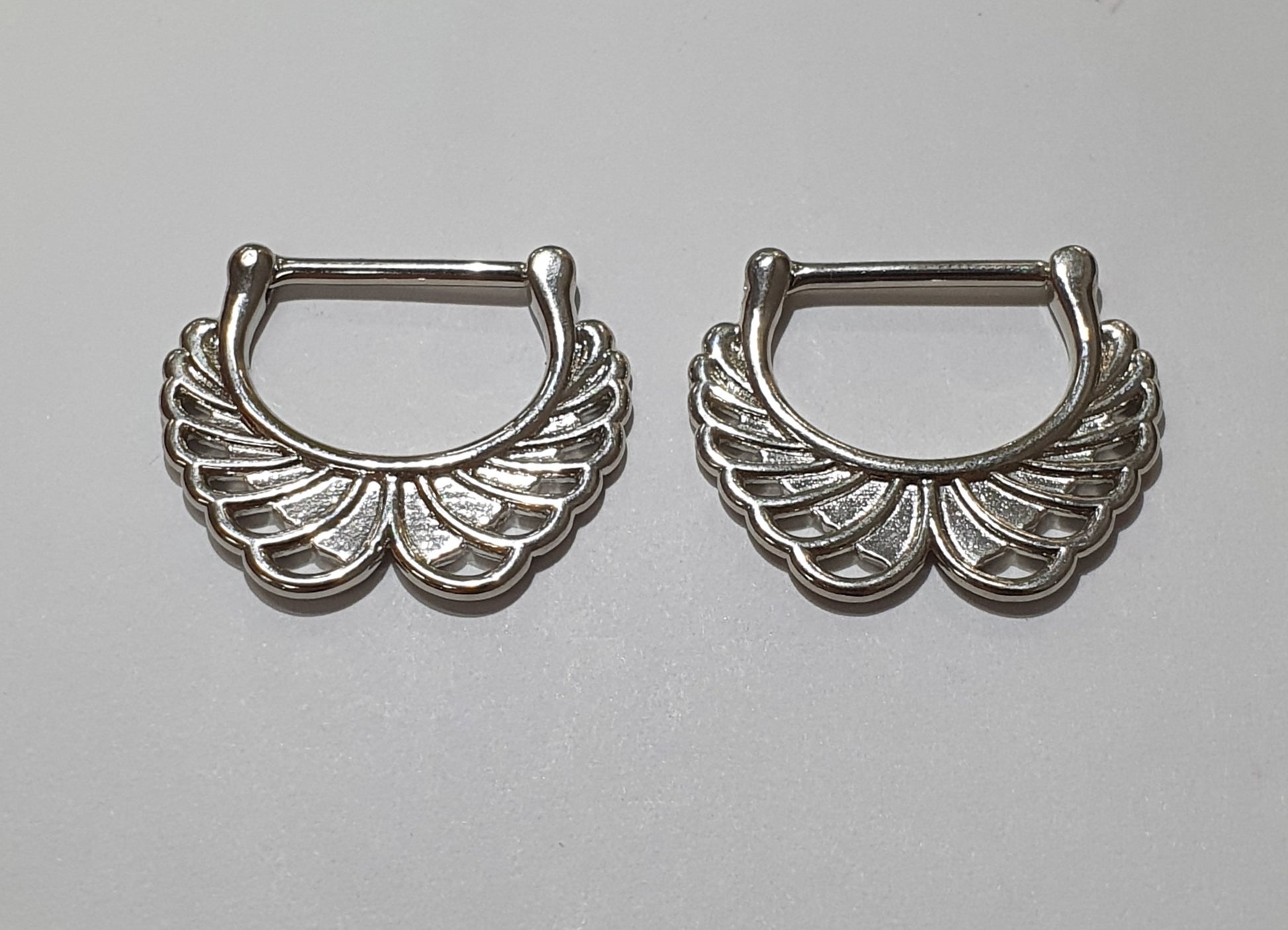 Spice up your look with these angelic nipple clickers. Ideal for nipple piercings, consider the size of the nipple before purchasing - must be less than 14mm wide. Sold individually.